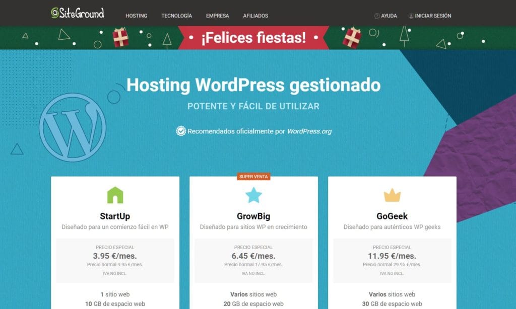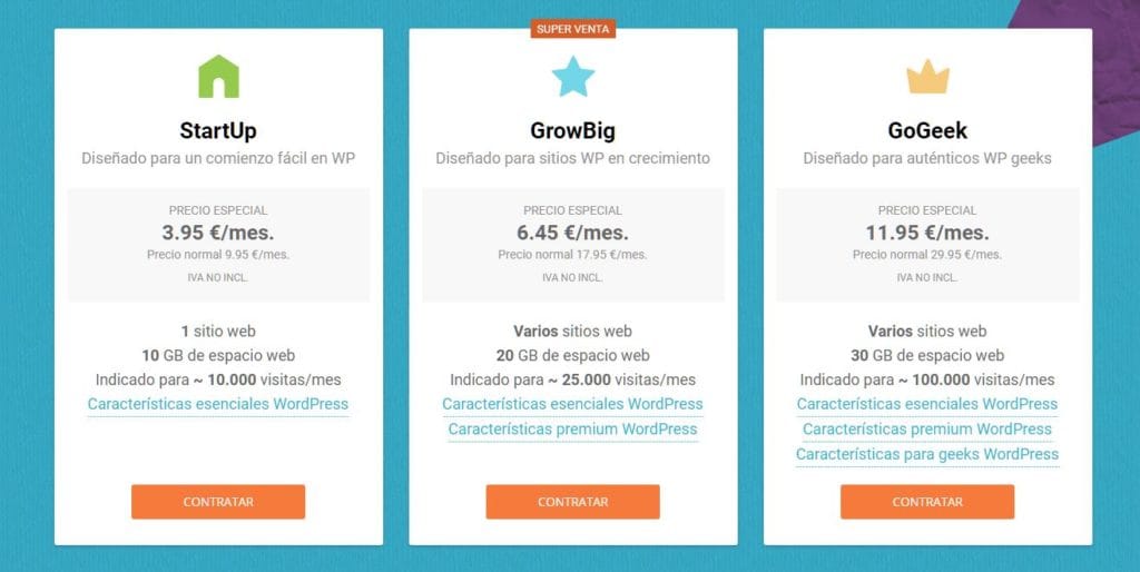 Siteground tiene 3 planes que tienen detallados en su web desde 3.95€ al mes